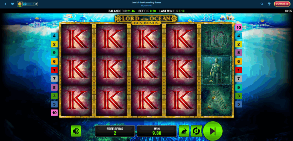 Whatever currency you use, the AquaWin Casino Lord of the Ocean pokie displays your balance in euros. The bets range from €0.2 to €30, which is an acceptable range for casual players. Although these limits may seem disappointing for high-stakes enthusiasts, such restrictions are dictated by the high-volatility gameplay. If you maximize the bonus feature, the pokie rewards you with a x5000 multiplier.