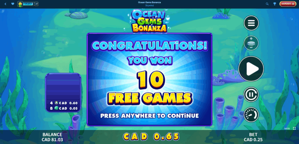 Following this, the AquaWin Casino Ocean Gems Bonanza pokie lands the required scatters and begins free spins.
